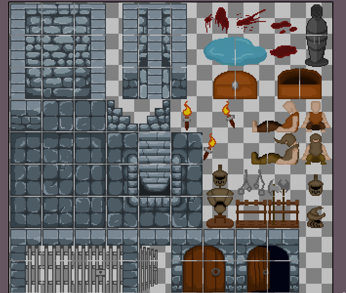 I've become pseudo environmental artist for the team and have been working on both overworld and in combat backgrounds for the game. With this I have finally finished our base tile sheet for the dungeon and plan on making a few more with slight changes (mostly with colours and props) to differentiate the different floors.